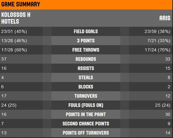 ΚΟΛΟΣΣΟΣ ΡΟΔΟΥ (Λυκογιάννης): Λαρεντζάκης 7(2), Μανωλόπουλος 6(2), Ντέιβις 2, Γεωργαλής 3, Λίντεν 2, Άχονεν 14(4/6β., 2/3διπ., 2/6τρ., 4ασ.), Σαλούστρος 16(2/4διπ, 4/4τρ., 9ρ.), Μακ Γκι 9(7ρ.), Ρέλεφορντ 7(6ρ., 6ασ.), Λιούις 10 (1/2β., 0/2διπ., 3/5τρ.).