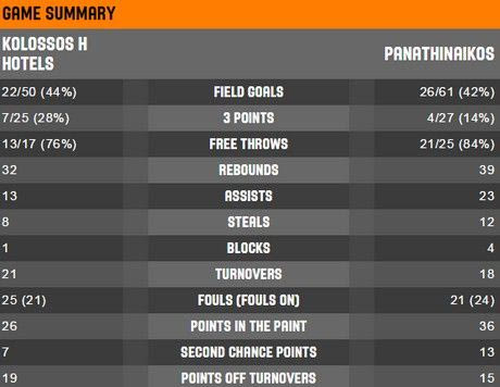 ΠΑΝΑΘΗΝΑΪΚΟΣ: 20/29 δίποντα, 2/18 τρίποντα, 15/18 βολές, 27 ριμπάουντ, 18 ασίστ, 12 λάθη, 7 κλεψίματα, 2 τάπες.