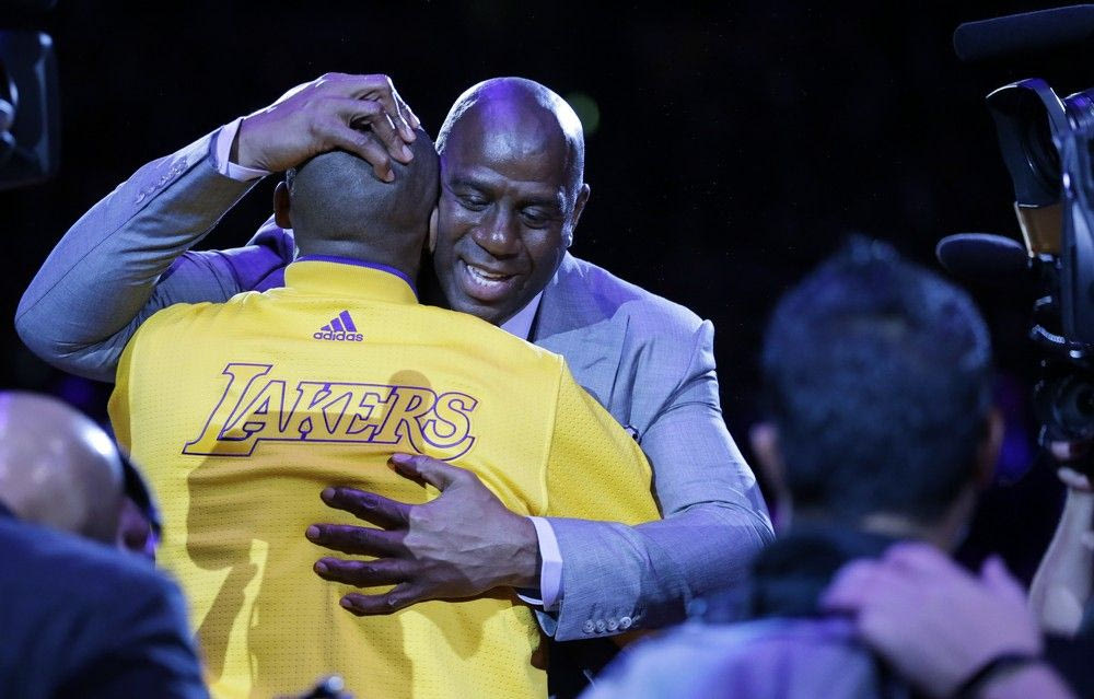 Ο Κόμπε Μπράιαντ αγκαλιάζεται με τον Μάτζικ Τζόνσον πριν από το τελευταίο παιχνίδι της καριέρας του. AP Photo/Jae C. Hong