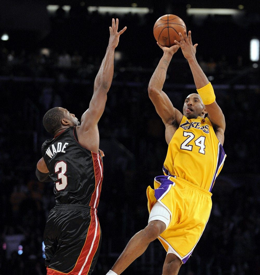 Ο Κόμπε Μπράιαντ πετυχαίνοντας ένα από τα δυσκολότερα, νικητήρια, καλάθια της καριέρας του στη λήξη του αγώνα με τους Χιτ στο Λος Άντζελες, έχοντας τον Ντουέιν Γουέιντ να του καλύπτει το οπτικό πεδίο. Ένα καλάθι statement της διαδρομής του στο μπάσκετ. AP Photo/Mark J. Terrill