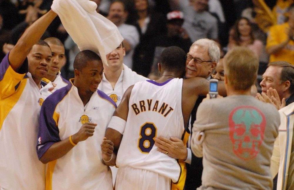 Ο Κόμπε Μπράιαντ δέχεται τα συγχαρητήρια του Φιλ Τζάκσον για τους 81 πόντους επί των Ράπτορς, την κορυφαία ως σήμερα επίδοση του τρέχοντος αιώνα στο ΝΒΑ AP Photo/Matt A. Brown, File