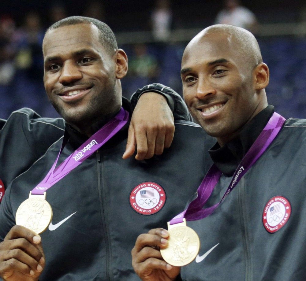 Ο Κόμπε Μπράιαντ καμαρώνει για το χρυσό μετάλλιο στους Ολυμπιακούς Αγώνες του Λονδίνου (2012), ποζάροντας παρέα με τον Λεμπρόν Τζέιμς AP Photo/Charles Krupa, File