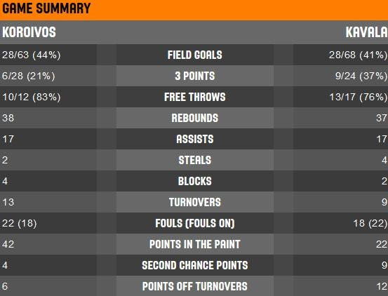 ΚΑΒΑΛΑ (Γιατζόγλου): Λέιζερ 19(1/1β., 6/9διπ., 2/3τρ., 6ριμπ., 5ασ.), Ουίλιαμς 13(1/1β., 6/10διπ.), ΜακΚί 6, Σταμπουλής 4(1), Κοστόφ 4, Καλαϊτζίδης 2, Γιαννακίδης 9(3/5τρ.), Λίβας, Δεμερτζής, Κρομά 21(4/7β., 4/13διπ., 3/7τρ., 9ριμπ., 5ασ.).