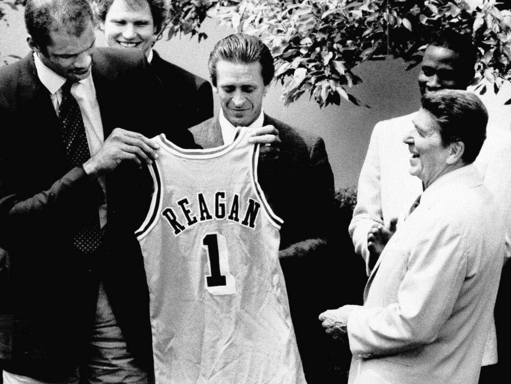 O Πλανητάρχης Ρόναλντ Ρίγκαν παραλαμβάνει από τον Καρίμ Αμπντούλ Τζαμπάρ μια φανέλα των Λέικερς, στην επίσκεψη των πρωταθλητών του 1985 στο Λευκό Οίκο. (AP Photo/Bob Daugherty) AP