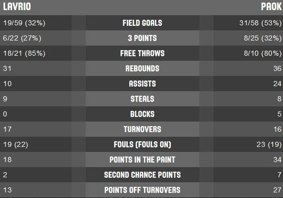 Ο ΠΑΟΚ στο ξεκίνημα του αγώνα ήταν μπροστά με 3-6 και ο Μαργαρίτης (οχτώ πόντους) διαμόρφωσε το 3-12 στο 5′. Η διαφορά “ανέβηκε” κι άλλο για τον “Δικέφαλο” (3-16), το Λαύριο μείωσε σε 6-16 (στο 6-18 ο Μάρκοβιτς χρεώθηκε με τεχνική ποινή για διαμαρτυρία) αλλά ο ΠΑΟΚ επανέφερε την διαφορά στους 13 πόντους (7-20). Λίγο πριν το τέλος του πρώτου δεκαλέπτου, χρεώθηκε με τεχνική ποινή ο πάγκος του “Δικεφάλου” και στο 10′ ο ΠΑΟΚ νικούσε με 12-20. Στις αρχές του δευτέρου δεκαλέπτου ο ΠΑΟΚ ήταν στο +12 (14-26), ο Μπόλντς έκανε το 16-26 και στο 15′ ο Τέπιτς διαμόρφωσε το 18-32. Με σερί 5-0 “γράφτηκε” το 23-32, ο ΠΑΟΚ ξέφυγε ξανά (23-38 στο 17′) και ο πολύ καλός Μαργαρίτης (14 πόντους) έδωσε αέρα 17 πόντων (23-40) στον “Δικέφαλο”. Στο ημίχρονο ο ΠΑΟΚ (ικανοποιητική η απόδοσή του) ήταν μπροστά με 27-43 (νωρίτερα κέρδιζε με 23-43).