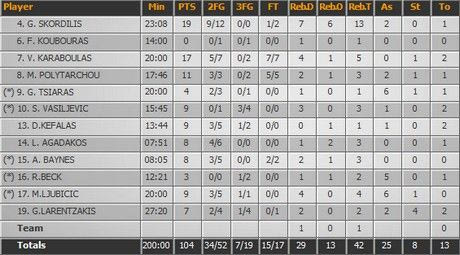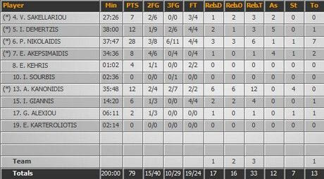 Οι 11 από τους 12 παίκτες που χρησιμοποίησε ο Σκουρτόπουλος σκόραραν, με τον Σκορίδη να είναι ο κορυφαίος με 19 πόντους με 9/12 δίποντα και 1/1 βολές.