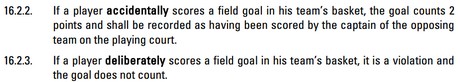 Στο άρθρο 16.2.2 αναφέρεται πως “αν ένας παίκτης κατά λάθος σκοράρει με εντός πεδιάς σουτ στο καλάθι της ομάδας του, το σουτ μετράει για δύο πόντους και θα χρεωθεί σαν να έχει επιτευχθεί από τον αρχηγό της αντιπάλου ομάδας που βρίσκεται στο παρκέ”.