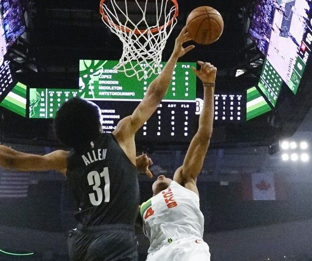 Brooklyn Nets' Jarrett Allen blocks a shot by Milwaukee Bucks' Giannis Antetokounmpo during the first half of an NBA basketball game Saturday, Dec. 29, 2018, in Milwaukee. (AP Photo/Morry Gash) AP