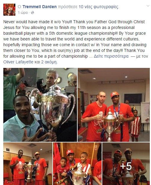 “Δεν θα τα καταφέρναμε ποτέ χωρίς Εσένα. Σε ευχαριστώ, Κύριε Ιησού Χριστέ, που μου έδωσε την ευκαιρία να ολοκληρώσω την ενδέκατη σεζόν μου σαν επαγγελματίας με την κατάκτηση του πέμπτου πρωταθλήματος στην καριέρα μου. Με την ευλογία σου ταξιδέψαμε σε όλο τον κόσμο και γνωρίσαμε διαφορετικές κουλτούρες, με την ελπίδα να επηρεάσαμε αυτούς με τους οποίους ήρθαμε σε επαφή ώστε να έρθουν πιο κοντά σε Σένα, πράγμα που είναι και η αποστολή μου. Σε ευχαριστώ που μου επέτρεψες να είμαι μέλος πρωταθλητριών ομάδων σε Βέλγιο, Αυστραλία, Γαλλία, Ισπανία και τώρα στην Ελλάδα. Θεού θέλοντος, θα έχω κι άλλα χρόνια μπροστά μου για να σε τιμώ μέσα στο γήπεδο κι ελπίζω να κατακτήσω τον τίτλο της Ευρωλίγκας που μου λείπει. Πάντα είμαι ευγνώμων για ό,τι έκανες, κάνεις και θα κάνεις για μένα στο μέλλον και αφήνω τη ζωή μου να δείχνει την ευγνωμοσύνη μου”, ανέφερε ο Ντάρντεν.