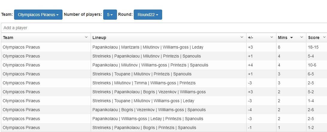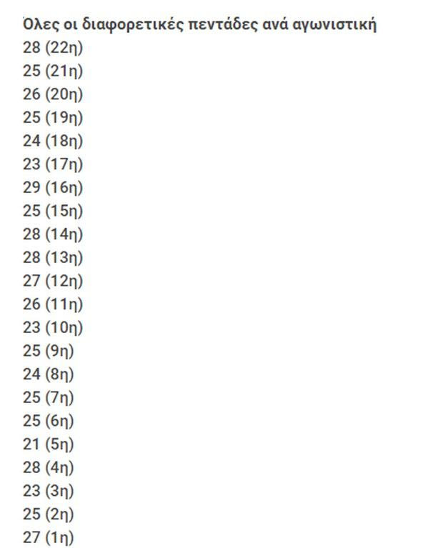 Βέβαια ποτέ του μέχρι τώρα δεν έπεσε κάτω από το φράγμα των 20. Ιδίως δε στο δεύτερο γύρο, παίζει σταθερά με +25 διαφορετικά σχήματα ανά αγώνα, τα οποία ποικίλουν (ψηλά, χαμηλά, με δύο σέντερ).