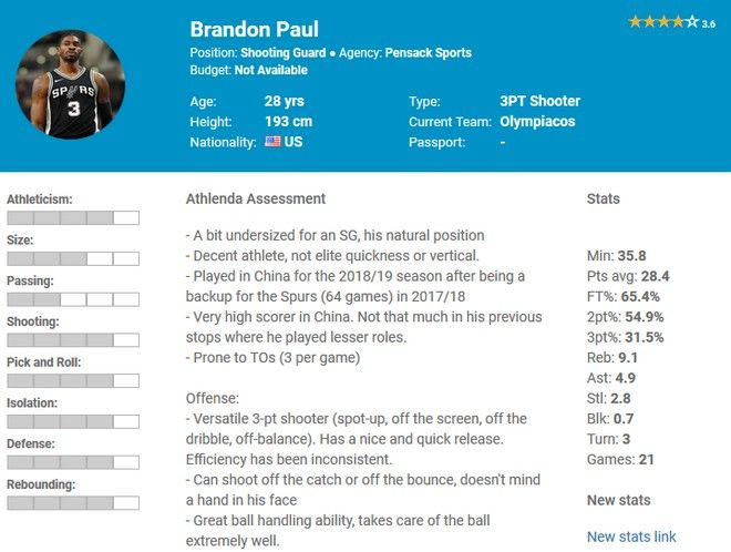 Στο εισαγωγικό σημείο που λάβαμε, ο Μπράντον Πολ παρουσιάζεται ως ένας ελαφρώς κοντός σούτινγκ γκαρντ, αθλητικά άριστος, αλλά όχι πολύ ταχύς. Το γεγονός πως πέρυσι έπαιξε στο κινέζικο πρωτάθλημα και είχε υψηλά νούμερα στο σκοράρισμα (28.4 πόντοι, έχοντας σε ματς ακόμη και 51) δεν ισοσταθμίζεται με δευτερεύοντα ρόλο που κατείχε στις προηγούμενες ομάδες της καριέρας του, ενώ είναι επιρρεπής στα λάθη.