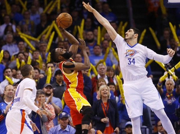 Houston Rockets guard James Harden, center, shoots as Oklahoma City Thunder center Enes Kanter (34) defends during an NBA basketball game between the Houston Rockets and the Oklahoma City Thunder in Oklahoma City, Sunday, April 5, 2015. Houston won 115-112. (AP Photo/Sue Ogrocki) AP