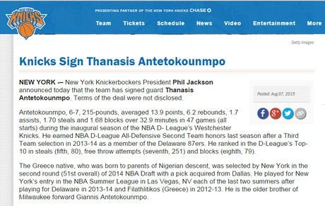 Δια στόματος Φιλ Τζάκσον ανακοινώθηκε η ένταξη του Θανάση Αντετοκούνμπο στους Νιου Γιορκ Νικς.