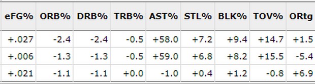 Όλα τα παραπάνω λειτουργούν ως συγκοινωνούντα δοχεία της συνολικής αμυντικής αδυναμίας των Λέικερς. Η οποία είναι ακόμη πιο φτωχή ενόσω ο Λεμπρόν Τζέιμς βρίσκεται εκτός αγώνα – όποτε αυτό συμβαίνει. Διότι με αυτόν παρόντα οι Λέικερς πετυχαίνουν 110.4 πόντους και δέχονται 108.9, κόντρα στους 3.5 πόντους λιγότερους που χάνουν στην επίθεση και τους 112.3 που φορτώνεται το καλάθι τους! Ανά 100 κατοχές πάντα.