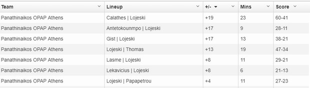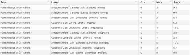 Αντίστοιχα θετικό είναι το πρόσημο όταν στα τρίδυμα που έφτιαχνε ο Λοτζέσκι, με τους Καλάθη / Αντετοκούνμπο (+13 με 20-7 σε 7 λεπτά), με Αντετοκούνμπο / Γκιστ (+13 επίσης), με Αντετοκούνμπο / Τόμας (+15 σε 8 λεπτά) και με Καλάθη / Γκιστ (+15 σε 10 λεπτά).