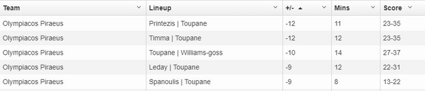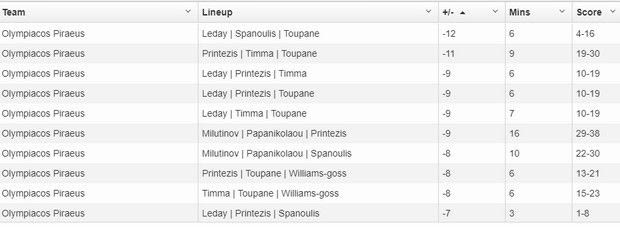 Κυρίως δεν δικαιώθηκε, βέβαια, για τις ψηλές 5άδες που επέλεξε να χρησιμοποιήσει, ελλείψει Στρέλνιεκς και με τον Μάντζαρη παροπλισμένο, για ν’ αντιπαρέλθει την αντίπαλη αθλητικότητα, ‘θυσιάζοντας’ τον Παπανικολάου στο ‘2’. Δεν του βγήκε. Ήταν έξω από τα νερά του επιθετικά ο Έλληνας φόργουορντ, δεν συνέδραμε καθόλου σε αυτόν τον τομέα και εκτέθηκε. Απόδειξη; Το -9 στο δίδυμο με Μιλουτίνοφ σε 12 λεπτά συνύπαρξης και το -7 με Πρίντεζη σε 18 λεπτά.