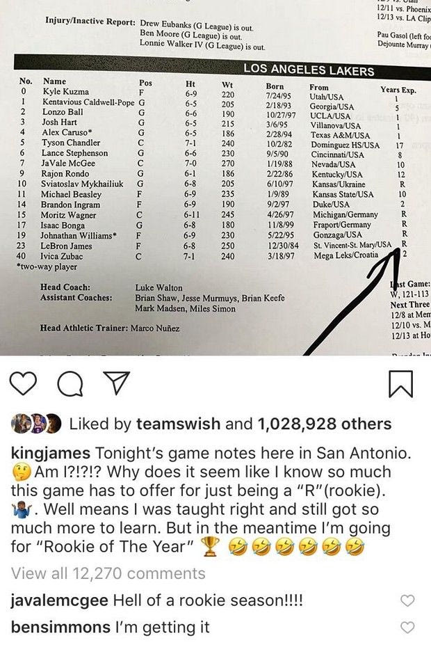 Κι αν ο συμπαίκτης του, Τζαβάλ Μακγκί, παραδέχθηκε ότι ο Τζέιμς θα ήταν ‘απίστευτος ρούκι της σεζόν’, υπάρχει ένα σχόλιο μεταξύ των δεκάδων χιλιάδων κάτω από το ποστάρισμα που ίσως μας αναγκάσει να ξανασκεφτούμε το αν τεχνικά μπορεί ο Τζέιμς να πάρει αυτό το βραβείο στα 33 του.