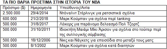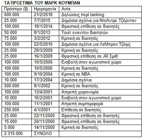 Πρόστιμο 500.000 δολάρια εκτός του Κούμπαν είχε επιβληθεί στον ιδιοκτήτη του Μαιάμι και σε τρεις ομάδες (Λέικερς, Νικς, Νάγκετς) όπως βλέπετε και στο σχετικό πίνακα.