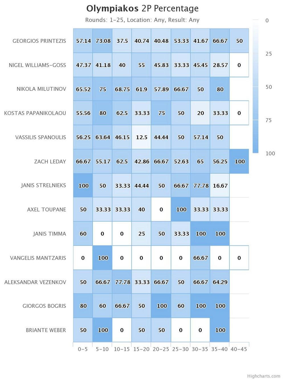 Τα ποσοστά του κυμαίνονται σταθερά από το 50% (30-35) ως το 80% (35-40), με το πιο ενδεικτικό να είναι το σχεδόν 66% στις επιθέσεις που παίρνει από το τζάμπολ ως το 4’59”.