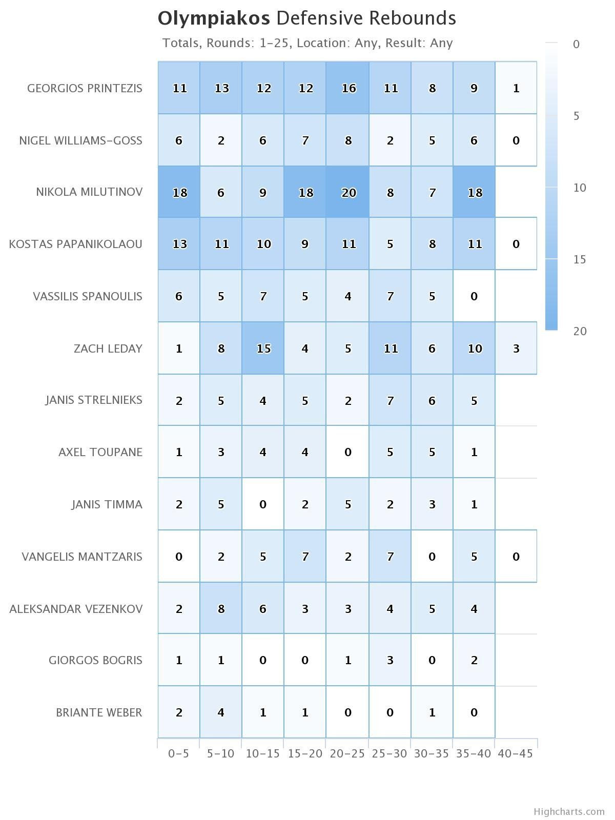 Στον ολόφρεσκο πίνακα της Newstats.eu μπορούμε να διακρίνουμε ξεκάθαρα ότι ο 24χρονος ψηλός είναι αυτός με τη μεγαλύτερη συνέπεια απόδοσης κατά τη διάρκεια των αγώνων.