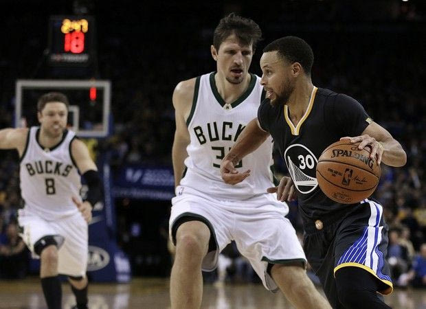 Golden State Warriors' Stephen Curry, right, drives the ball against Milwaukee Bucks' Mirza Teletovic during the second half of an NBA basketball game Saturday, March 18, 2017, in Oakland, Calif. (AP Photo/Ben Margot) AP
