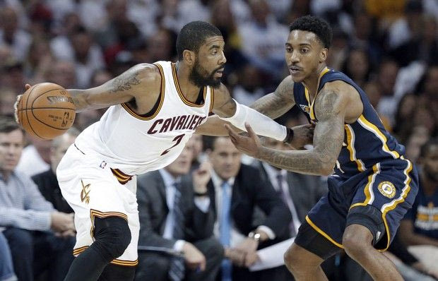 Cleveland Cavaliers' Kyrie Irving, left, drives past Indiana Pacers' Jeff Teague in the second half in Game 2 of a first-round NBA basketball playoff series, Monday, April 17, 2017, in Cleveland. The Cavaliers won 117-111. (AP Photo/Tony Dejak) AP