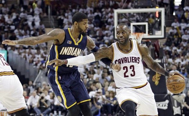 Cleveland Cavaliers' LeBron James (23) tries to drive past Indiana Pacers' Paul George (13) in the second half in Game 2 of a first-round NBA basketball playoff series, Monday, April 17, 2017, in Cleveland. The Cavaliers won 117-111. (AP Photo/Tony Dejak) AP
