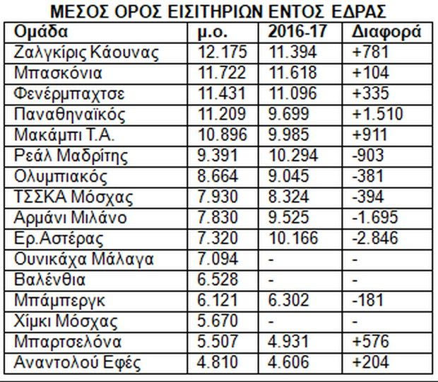 Όσο για τον Ολυμπιακό; Βρίσκεται αυτός τώρα στην 7η θέση της σχετικής λίστας με 8.664 εισιτήρια ανά αγώνα. Ένα νούμερο που συγκριτικά με το περσινό (9.045) μικρότερο κατά 381 εισιτήρια! Όχι αναμενόμενο για μία ομάδα που πέρυσι έφτασε (ξανά) στον τελικό!