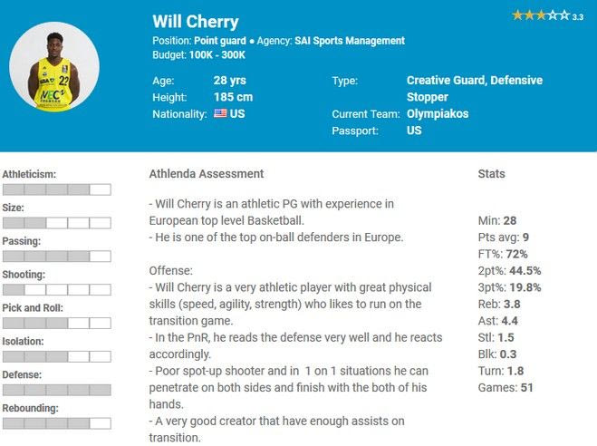Ο έβδομος, με τον οποίο συμπληρώθηκε το παζλ (δίπλα στη σταθερά του Νίκολα Μιλουτίνοφ), ήταν ένας φίλος από το πρόσφατο παρελθόν. Τον Γουίλ Τσέρι ο Ντέιβιντ Μπλατ τον έφερε τον περασμένο Απρίλιο για να κλείσει αξιοπρεπώς η περυσινή σεζόν. Ο 28χρονος Αμερικανός πρόλαβε να εμφανιστεί σε μόλις 3 ματς της κουτσουρεμένης παρουσίας των ‘ερυθρολεύκων’ στο πρωτάθλημα. Να όμως που με 11 πόντους, 5.3 ριμπάουντ και 3.3 ασίστ ανά 24 λεπτά συμμετοχής απέκτησε μια νέα ευκαιρία. Ο Ντέιβιντ Μπλατ τον διάλεξε ως τη σύνδεση του παλιού με τον νέο γι’ αυτό που έχει στα σκαριά.