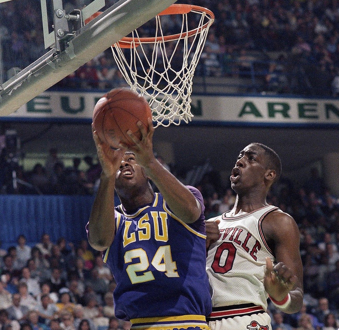 Ο Τζον Γουίλιαμς, παίκτης του κολλεγίου LSU, προσπαθεί να σουτάρει, ενώ ο Μαρκ Μακσουέιν του Λούιβιλ προσπαθεί να τον κόψει AP Photo/David Breslauer