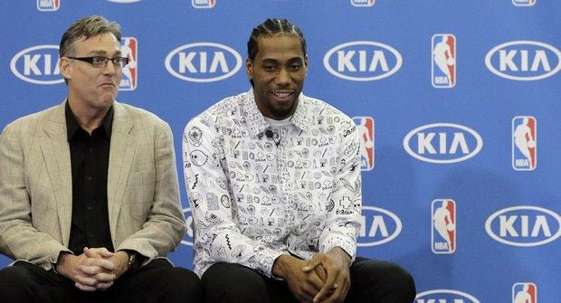 San Antonio Spurs Kawhi Leonard, right sits with Spurs general manager R.C. Buford, right, during a news conference where Leonard was named the NBA defensive player of the year , Monday, April 18, 2016, in Austin, Texas. (AP Photo/Eric Gay) AP Photo/Eric Gay