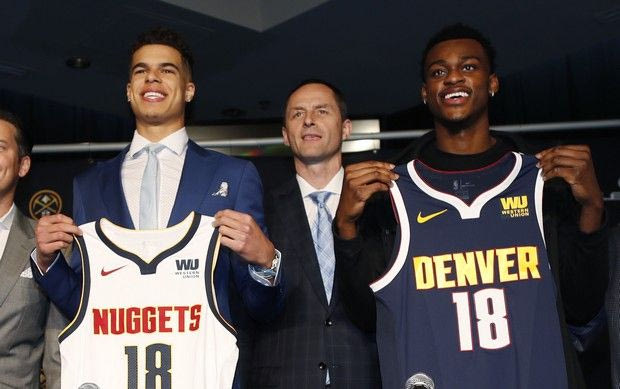 From left to right, Thomas Welsh, one of the Denver Nuggets' two second-round picks in the NBA Draft, joins Josh Kroenke, team president and governor, first-round pick Michael Porter Jr., team general manager Arturas Karnisovas, the other second-round pick, Jarred Vanderbilt and Tim Connelly, the team's president of basketball operations, during a photo opportunity during a news conference to introduce the players to the media Friday, June 22, 2018, in Denver. (AP Photo/David Zalubowski) AP Photo/David Zalubowski