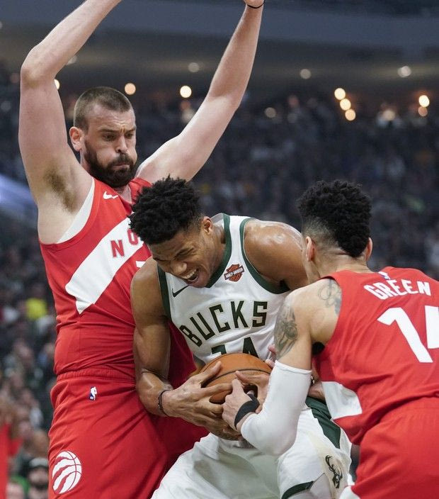 Milwaukee Bucks' Giannis Antetokounmpo tries to drive between Toronto Raptors' Marc Gasol and Danny Green during the first half of Game 5 of the NBA Eastern Conference basketball playoff finals Thursday, May 23, 2019, in Milwaukee. (AP Photo/Morry Gash) AP