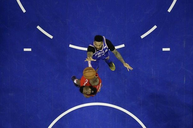 Philadelphia 76ers' Wilson Chandler, top, goes up for a shot against Houston Rockets' James Harden during the first half of an NBA basketball game, Monday, Jan. 21, 2019, in Philadelphia. Philadelphia won 121-93. (AP Photo/Matt Slocum) AP