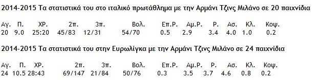 Προηγούμενες Ομάδες: Benetton Treviso (2009-2010), Scavolini Pesaro (2010-2012), Montepaschi Siena (2012-2013), Emporio Armani Milano (2013-2015)”.
