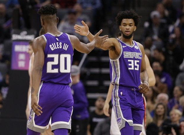 Sacramento Kings' forward Marvin Bagley III, right, receives congratulations from teammate Harry Giles III, left, after scoring against the Portland Trail Blazers during the second half of an NBA basketball game, Monday, Jan. 14, 2019, in Sacramento, Calif. The Kings won 115-107. (AP Photo/Rich Pedroncelli) AP