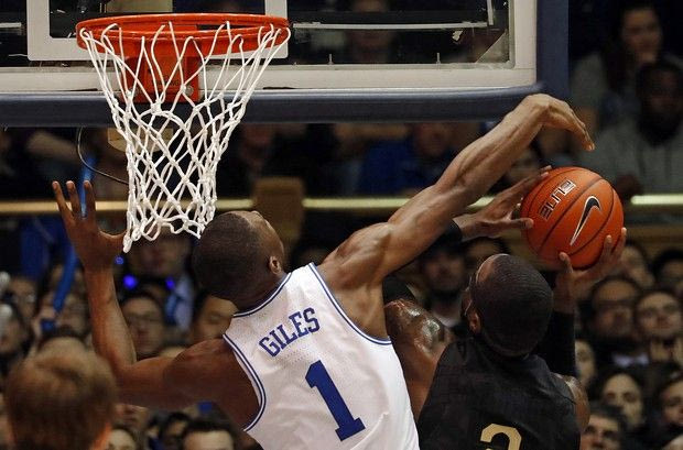 Duke's Harry Giles (1) attempts to block the shot of Pittsburgh's Michael Young (2) during the first half of an NCAA college basketball game in Durham, N.C., Saturday, Feb. 4, 2017. (AP Photo/Karl B DeBlaker) AP