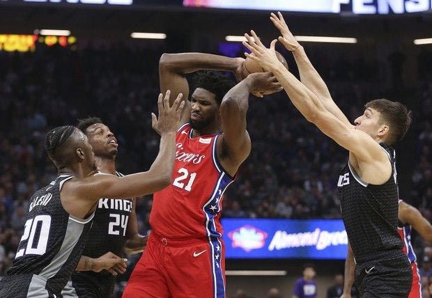 Philadelphia 76ers center Joel Embiid, center, is triple-teamed by Sacramento Kings' Harry Giles III, left, Buddy Hield and Bogdan Bogdanovic, right, during the first quarter of an NBA basketball game Saturday, Feb. 2, 2019, in Sacramento, Calif. (AP Photo/Rich Pedroncelli) AP