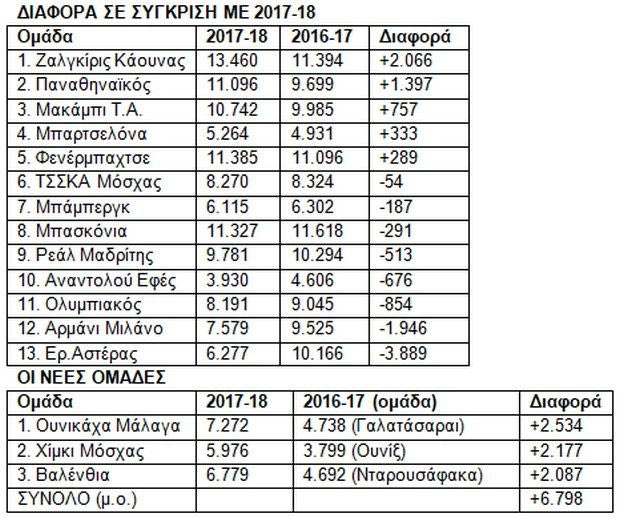 Από τις 13 ομάδες της διοργάνωσης που έπαιξαν και πέρυσι λιγότερες από τις μισές (5) σημείωσαν άνοδο στον μέσο όρο εισιτηρίων, ενώ 8 κατέγραψαν πτώση. Οι δύο εξ αυτών (Μιλάνο, Ερ.Αστέρας) σημαντική μάλιστα, με την ιταλική ομάδα να “χάνει” 2.000 θεατές ανά αγώνα και τη σερβική σχεδόν 4.000. Για το τελευταίο πάντως υπάρχει εξήγηση, αφού ο Ερυθρός Αστέρας χρησιμοποίησε τη μεγάλη αρένα (εκεί που θα διεξαχθεί το Φάιναλ Φορ) μόλις δύο φορές, τη στιγμή που πέρυσι είχε μετακομίσει σ’ αυτήν 7!