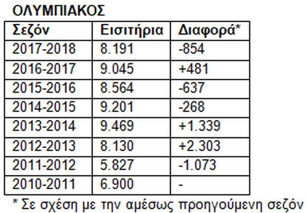 Ο Ολυμπιακός, από την πλευρά του, είχε σημαντικές απώλειες (πάνω από 850 θεατές ανά αγώνα) και βρέθηκε στην 11η θέση από τις ομάδες που έπαιξαν και πέρυσι.