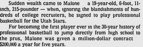 Σε μια εποχή που το κολέγιο αποτελούσε τον απαραίτητο προθάλαμο των επαγγελματιών παικτών, ο Μόουζες Μαλόουν δεν δίστασε να αυτοχριστεί επαγγελματίας φεύγοντας το 1974 απευθείας από το λύκειο για το ABA (την ανταγωνιστική λίγκα του ΝΒΑ) και ν’ ανοίξει το δρόμο σε όλους τους άλλους. Οι Γιούτα Σταρς τού προσέφεραν εγγυημένο συμβόλαιο πενταετούς διάρκειας με περισσότερα από ένα εκατομμύρια δολάρια (με βάση τα 200.000 το χρόνο), ποσό απίθανο για ένα φτωχόπαιδο που η μητέρα του αμειβόταν με λιγότερα από 100 δολάρια την εβδομάδα, και ο τότε 19άρης σέντερ έγινε ένας από τους πρώτους που τόλμησαν και πέτυχαν να καθιερωθούν άμεσα στο υψηλότερο επίπεδο χωρίς να έχουν… πανεπιστημιακή μόρφωση.