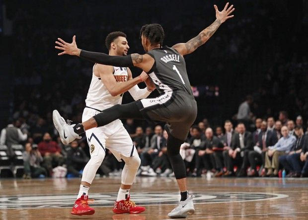Denver Nuggets guard Jamal Murray (27) looks to pass as Brooklyn Nets guard D'Angelo Russell (1) defends him with a dance during the first half of an NBA basketball game, Wednesday, Feb. 6, 2019, in New York. (AP Photo/Kathy Willens) AP