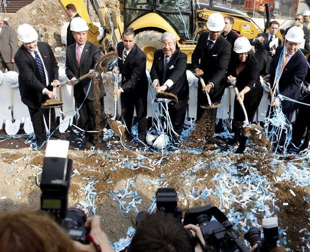 Forest City Ratner CEO Bruce Ratner, left, Mayor Michael Bloomberg, second from left, Governor David Paterson, third from left, Brooklyn Borough President Marty Markowitz, fourth from right, entertainer Jay-Z, third from right, Delia Hunley-Adossa, second from right, and President of Barclays Robert Diamond shovel dirt during the ground breaking for the Barclays Center in the Brooklyn borough of New York, Thursday, March 11, 2010. (AP Photo/Seth Wenig) ASSOCIATED PRESS