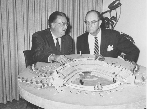 Walter O'Malley, left, president of the Los Angeles Dodgers shows New York Yankees owner Del Webb a model of the Dodgers' Chavez Ravine stadium, now being built, in Los Angeles, Ca., Nov. 21, 1960. O'Malley discusses his terms for allowing the American League to move into Los Angeles territory. Webb is chairman of the American League expansion committtee. (AP Photo) AP