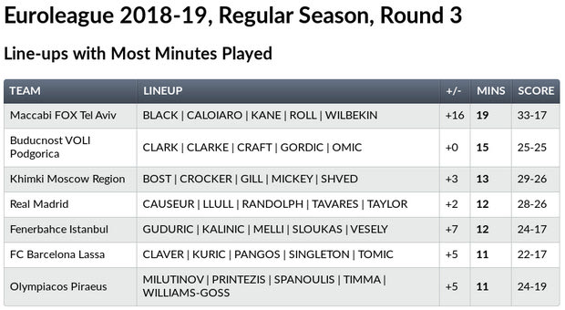 Στις κορυφαίες βρέθηκε και μια του Ολυμπιακού: αυτή των Milutinov, Πρίντεζη, Σπανούλη, Timma και William-Goss, του +5, στα 11 λεπτά κοινής συμμετοχής, διάστημα στο οποίο το επί μέρους σκορ ήταν 24-19.