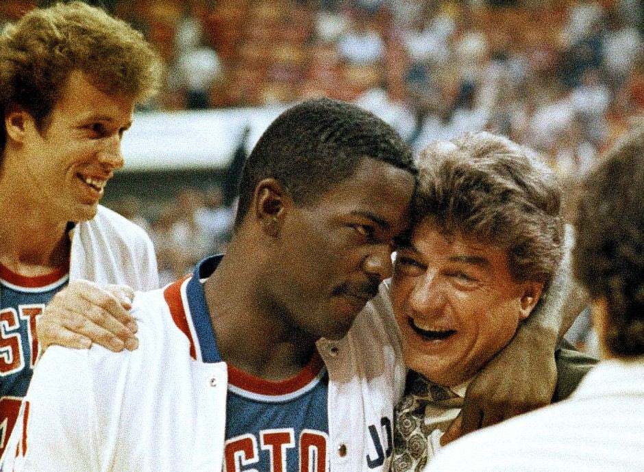 Ο Τσακ Ντέιλι στην αγκαλιά του Τζο Ντουμάρς, το 1990 (AP Photo/H. Joe Holloway Jr., File) ASSOCIATED PRESS