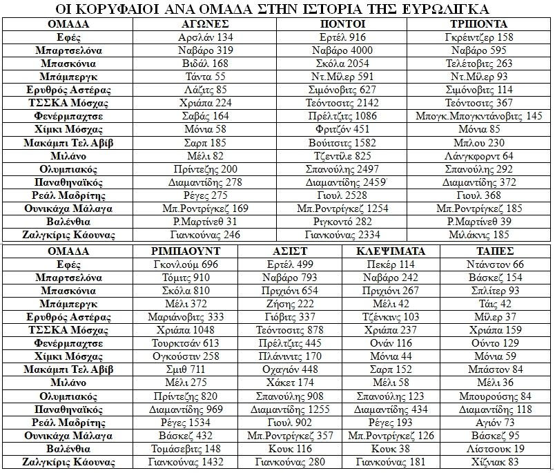 Οι κορυφαίοι στην ιστορία της Euroleague ανά ομάδα