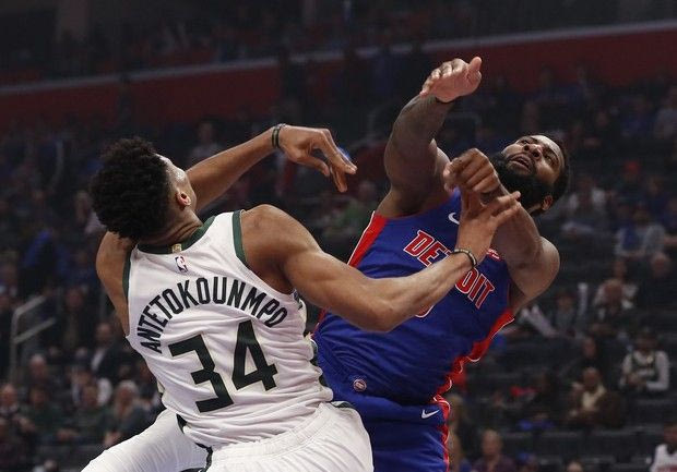 Detroit Pistons center Andre Drummond (0) attempts a shot as Milwaukee Bucks forward Giannis Antetokounmpo (34) defends during the second half of Game 3 of a first-round NBA basketball playoff series, Saturday, April 20, 2019, in Detroit. (AP Photo/Carlos Osorio) AP