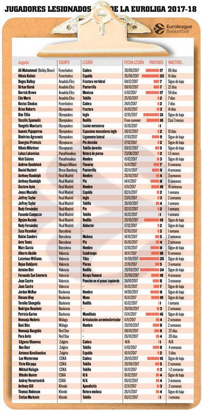 Ο πίνακας με τους τραυματίες παίκτες της εφετινής Ευρωλίγκας που δημοσίευσε η “El mundo deportivo” είναι πάντως αρκούντως χαρακτηριστικός.