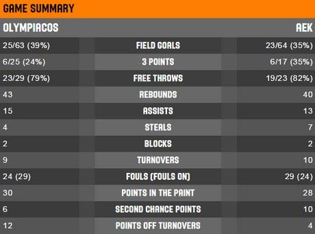 ΟΛΥΜΠΙΑΚΟΣ: 15/30 δίποντα, 5/19 τρίποντα, 14/20 βολές, 37 ριμπάουντ (28+9), 12 ασίστ, 6 λάθη, 3 κλεψίματα, 1 τάπα.